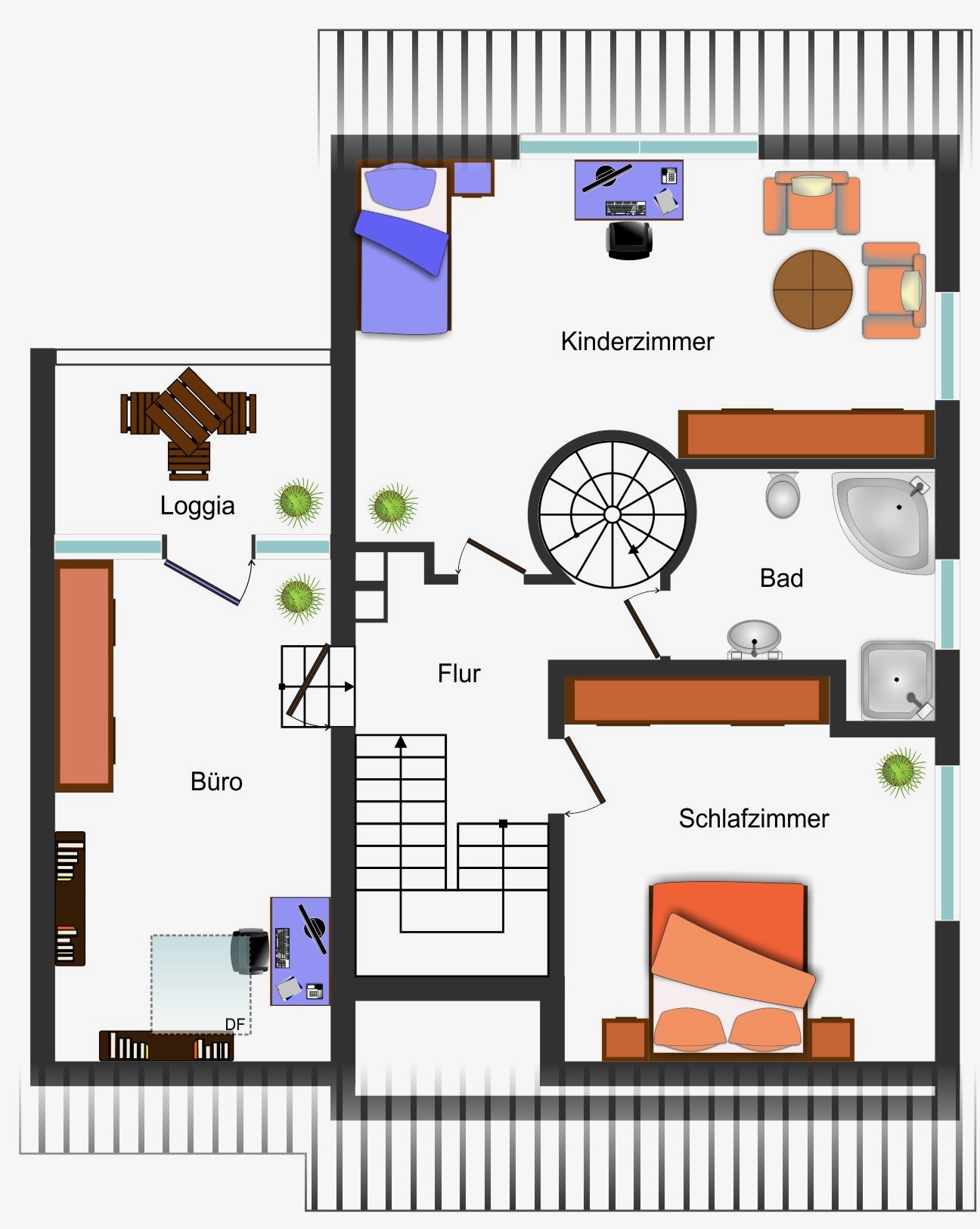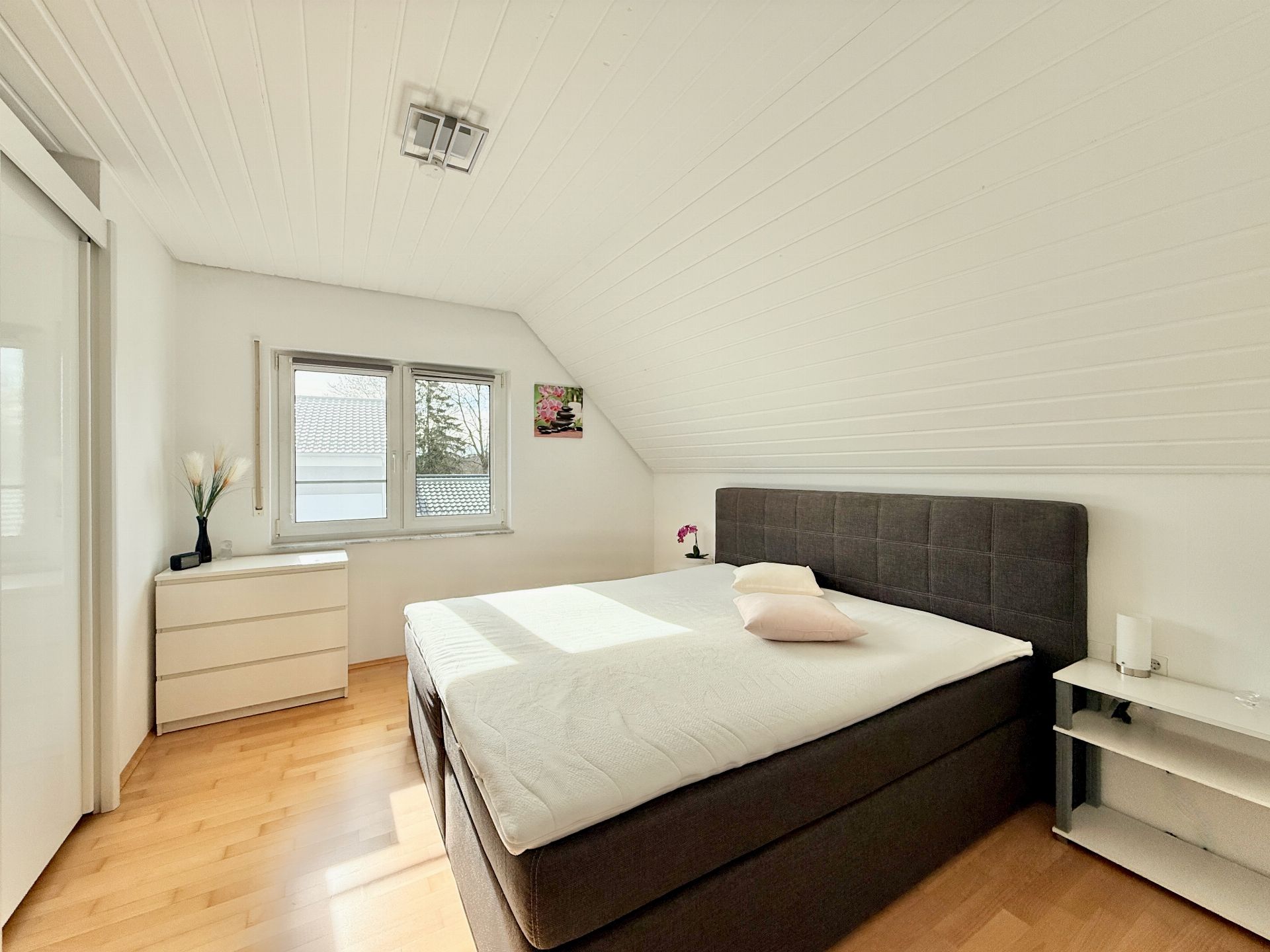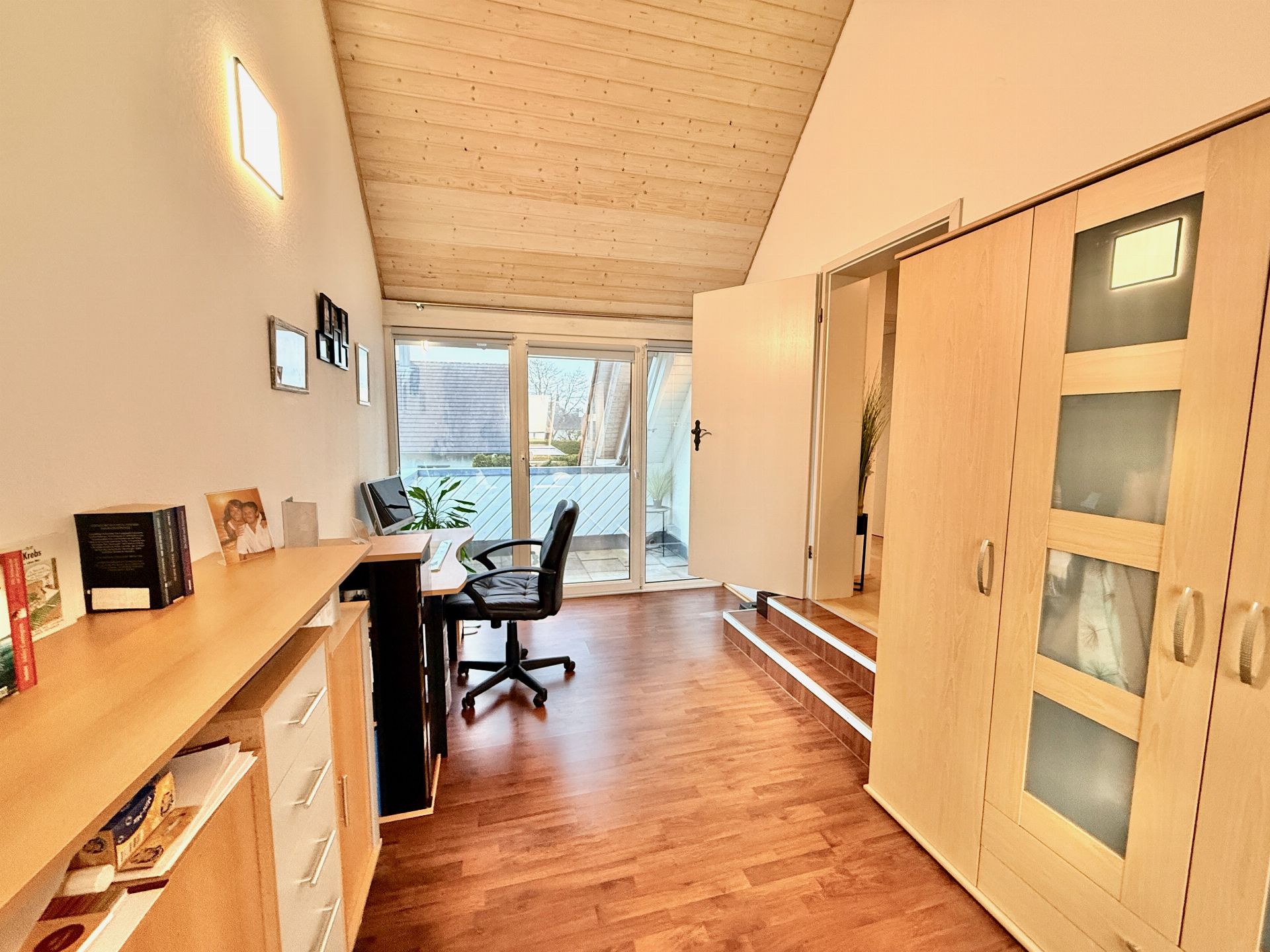 Im Obergeschoss finden Sie drei Schlafzimmer, davon wird eines aktuell als Büro (mit Balkon) genutzt. Die beiden Schlafzimmer haben eine tolle Größe und reichlich Platz für Schrank oder Ähnliches. Vom Obergeschoss aus geht eine Wendeltreppe zum großen Studio.